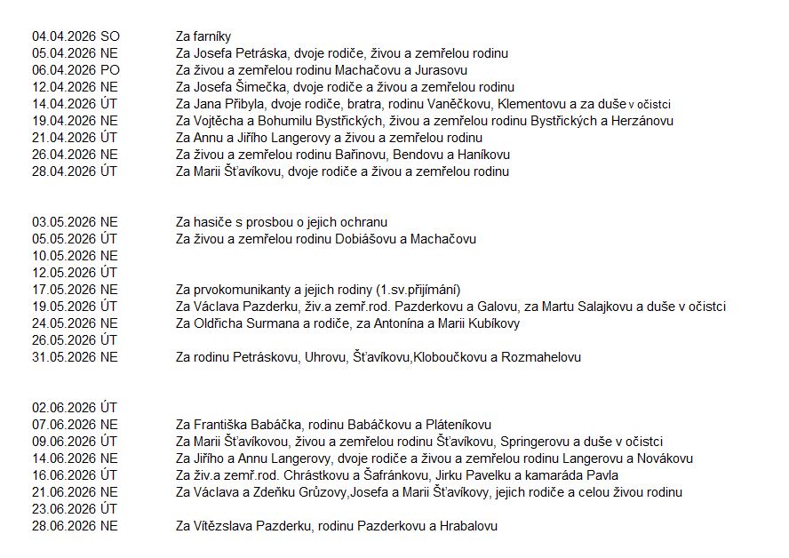 Bohoslužby se v naší farnosti slouží zpravidla v neděli nebo v úterý, přesná data a časy jsou uvedeny v aktuálních ohláškách. Rozpis úmyslů má na starost paní Marta Langerová.
